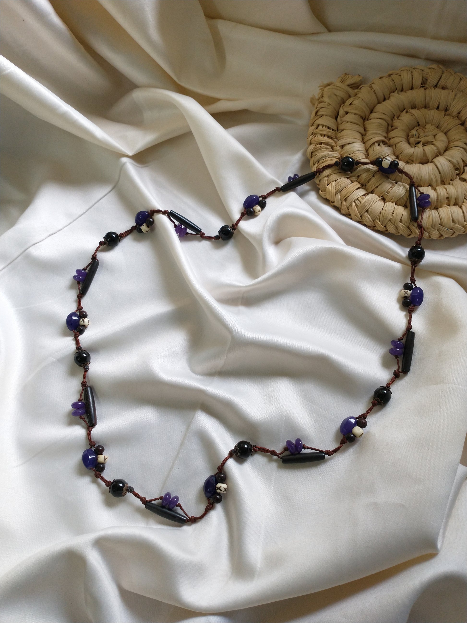 The X-Onyx is a long decorative necklace with an intricate design. Decorated with purple marble beads and beautiful wooden beads, the simple design brings an elegant look displaying royalty, luxury, peace, and power.